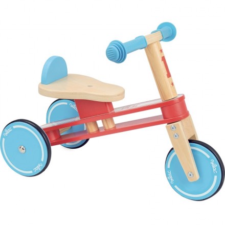 Un bonic tricicle de fusta de dos tonalitats amb un disseny original per moure's tant per dins com per fora de casa.